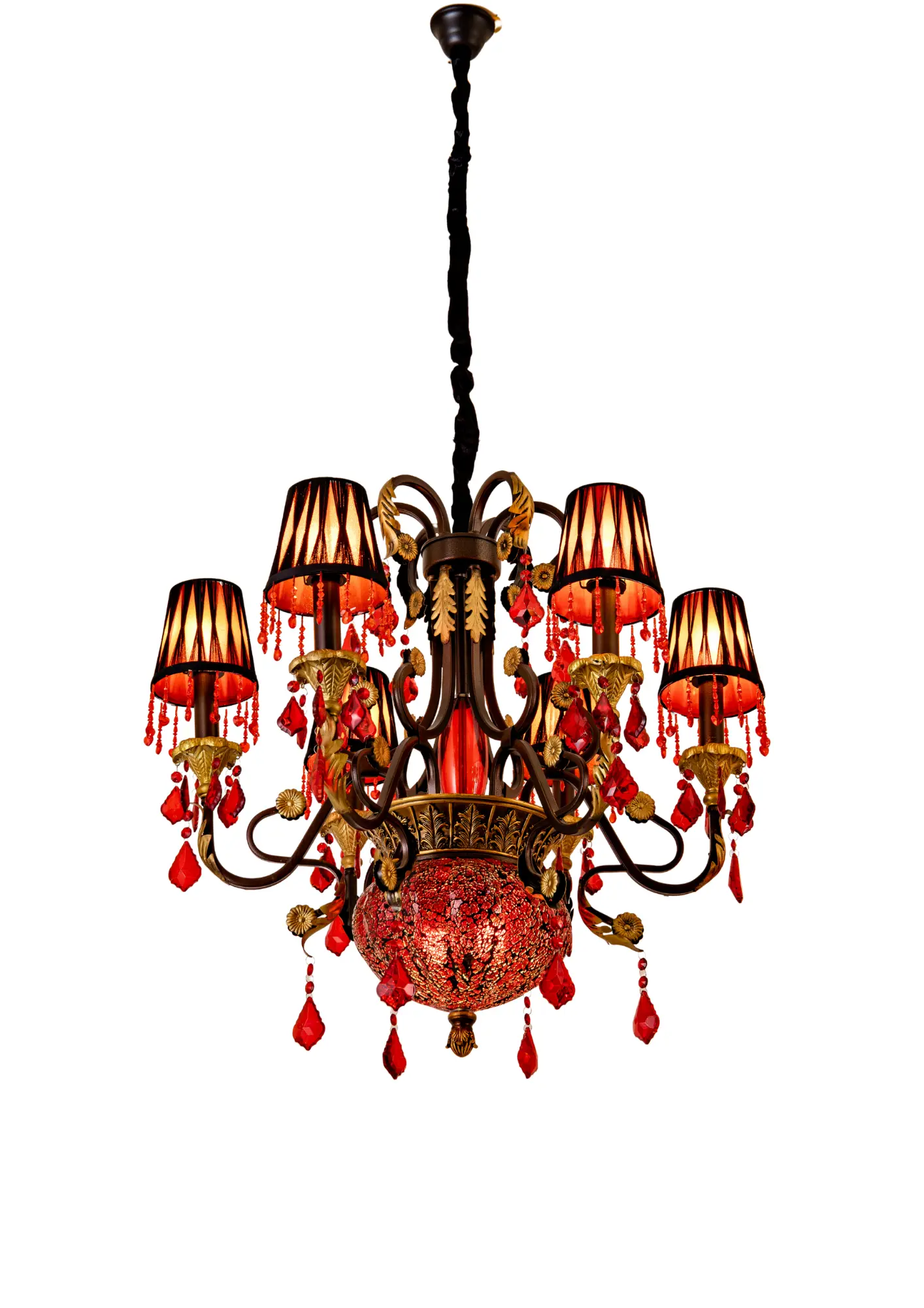 Make a bold statement with this antique-style red crystal chandelier, featuring royal fabric shades and a luxurious bronze frame. Perfect for interiors that demand opulence and individuality.
