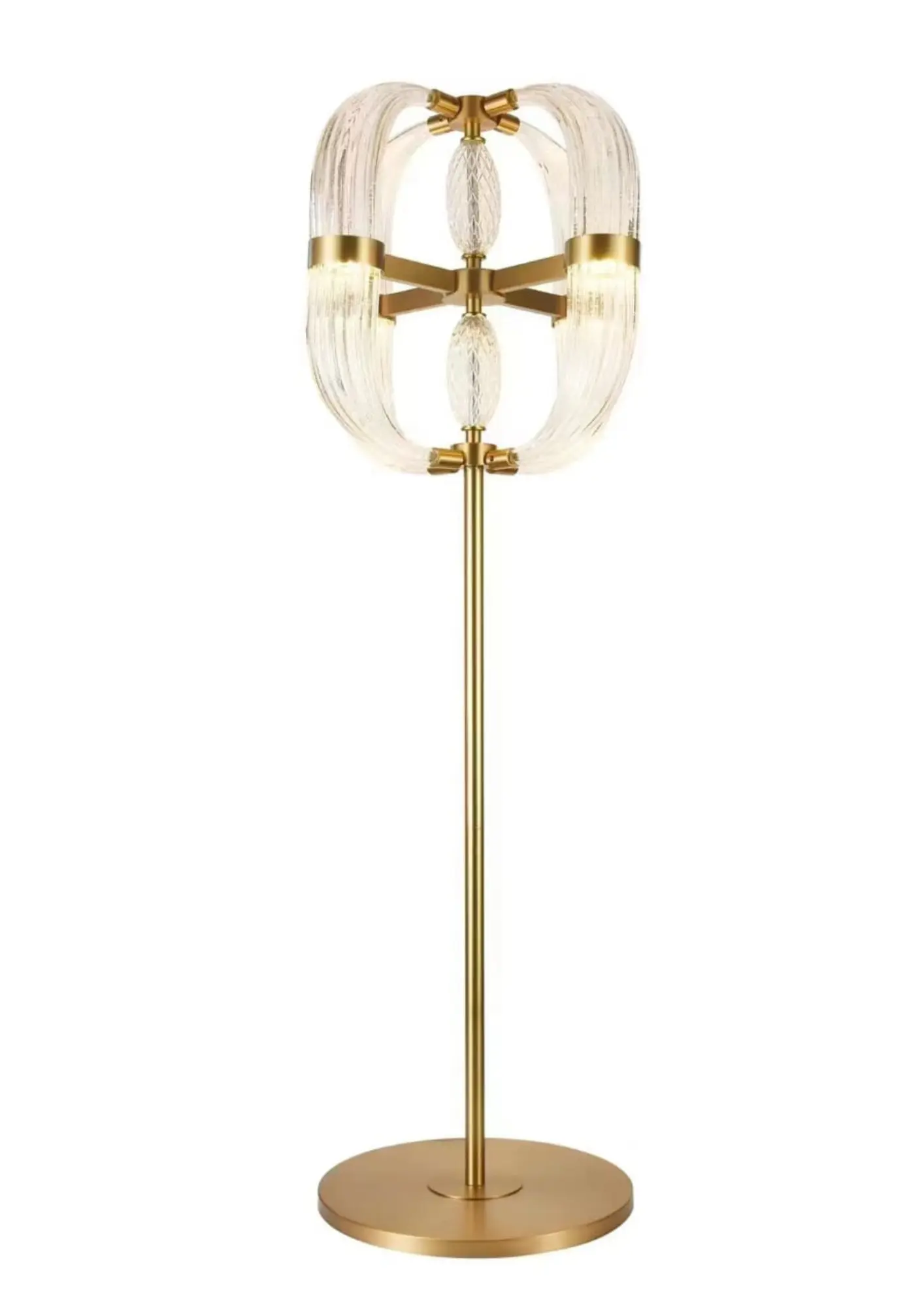 Bring elegance to your living space with the Aurora Luxe Floor Lamp – a stunning blend of golden brass and hand-crafted crystal, perfect for luxury interiors.