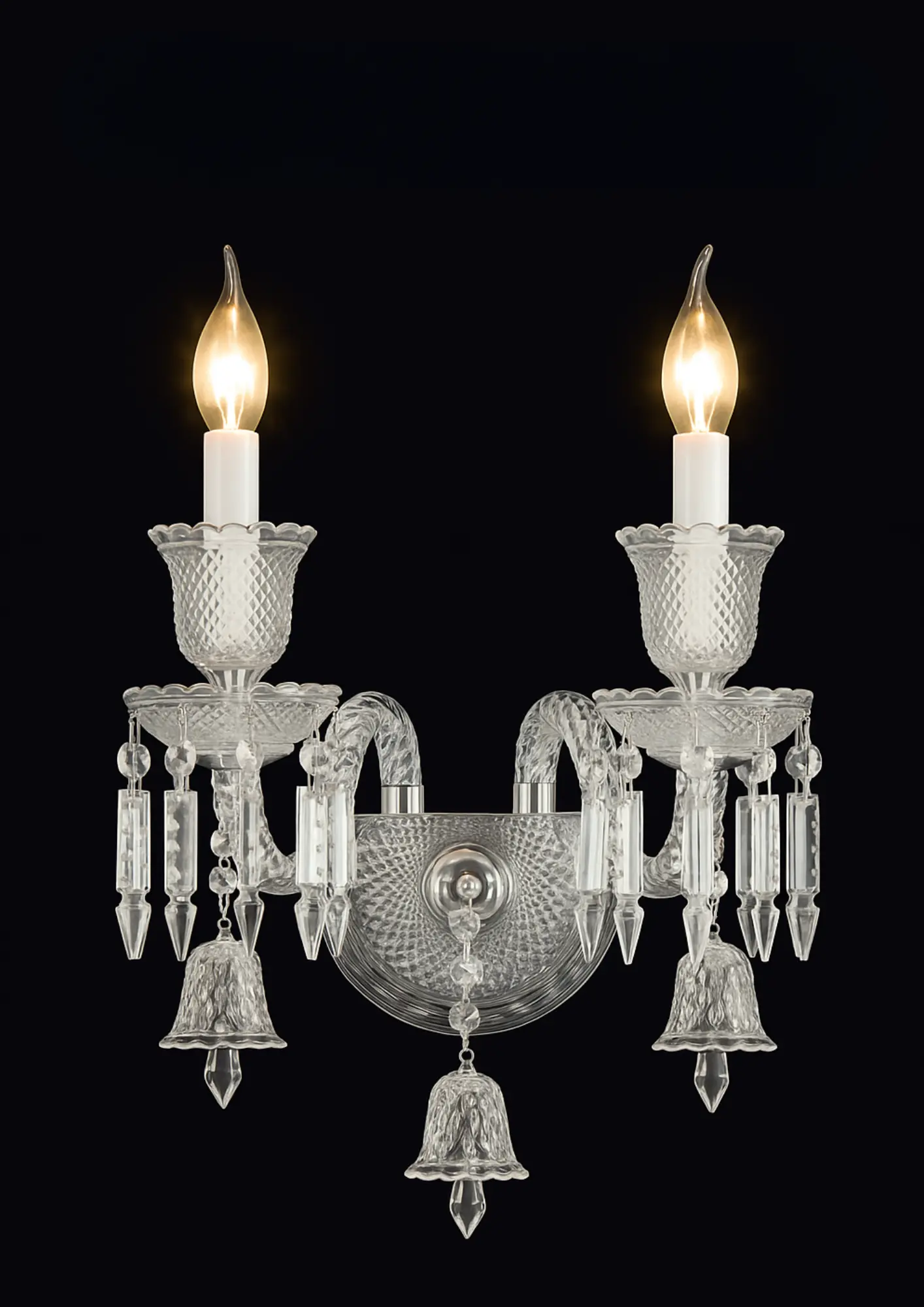 Introduce timeless elegance into your space with the Crystal Twin Arm Classic Wall Light. Designed with intricate hand-cut crystal arms, hanging prisms, and bell-shaped pendants, this wall light showcases old-world luxury and modern charm. The flame-style bulbs emit a soft, ambient glow, enhancing the warmth and sophistication of your interiors. Ideal for vintage-themed homes or luxury modern décor, it creates a statement without overpowering the room.
