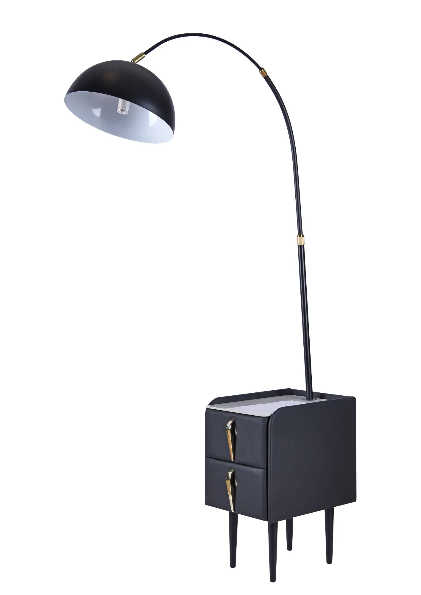 Introducing the LumiStand Black Arched Floor Lamp, a smart fusion of lighting and storage designed for modern lifestyles. Its tall, graceful arc supports a dome-shaped shade that casts warm, ambient light, while the base doubles as a compact two-drawer table — perfect for books, remotes, and essentials.