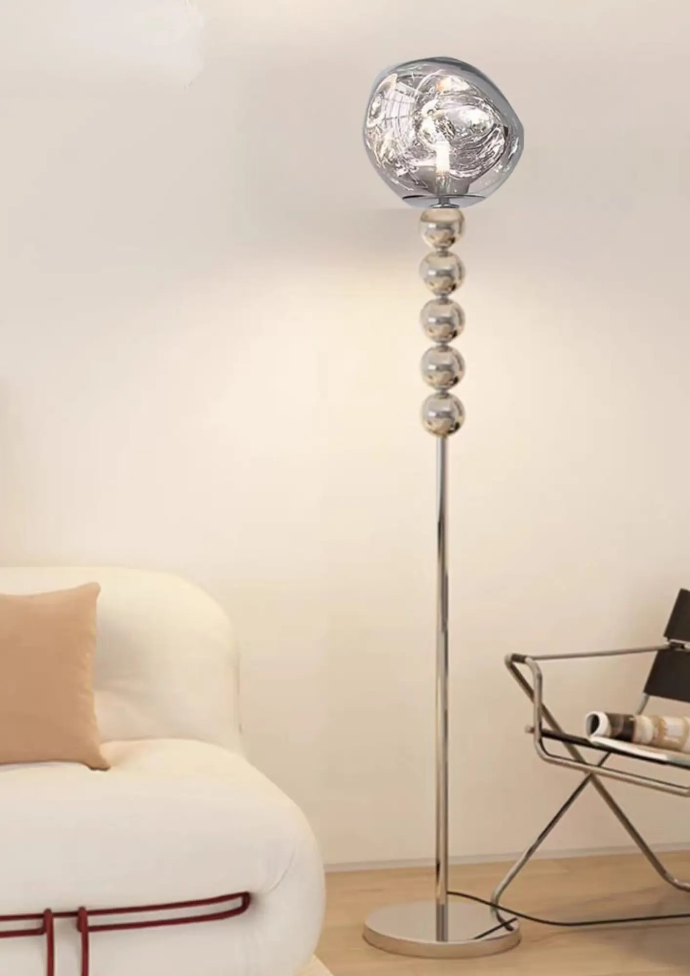 The Lunara Chrome Bubble Floor Lamp brings a striking blend of futuristic design and artistic flair into your space. Crafted with a chrome-plated stem composed of reflective spheres, it adds a playful yet luxurious touch to your décor. The uniquely shaped glass lampshade diffuses soft ambient light, creating a warm and inviting atmosphere in any room.