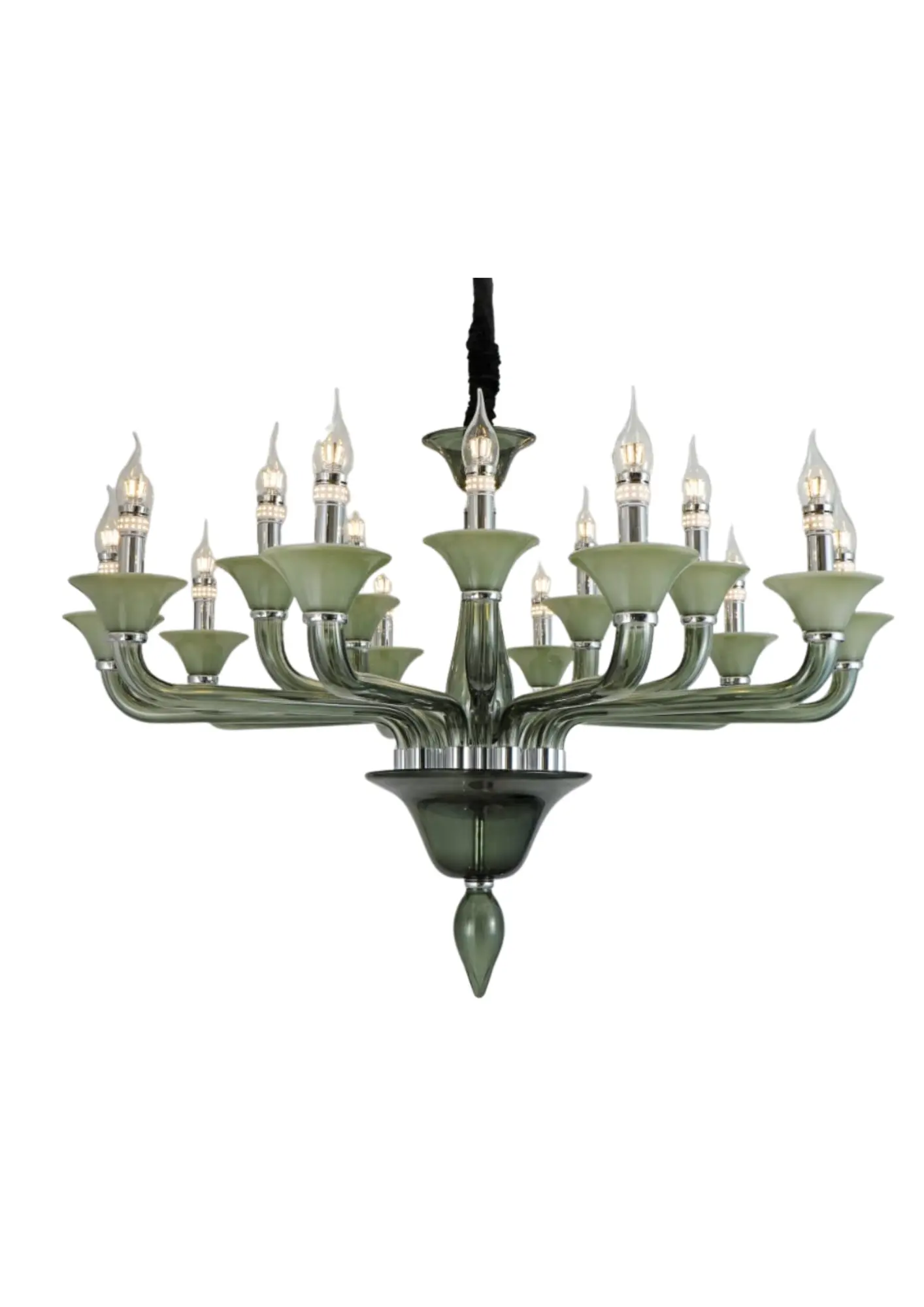 Each of the 18 lights is thoughtfully placed in an upward direction, symbolizing growth and grandeur, while the subtle green tint of the glass gives a unique touch that sets it apart from conventional chandeliers.