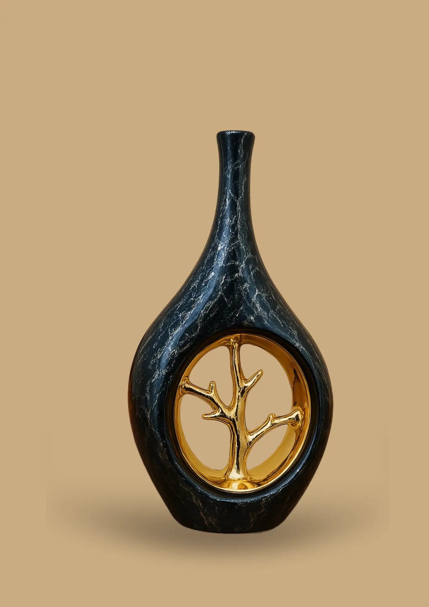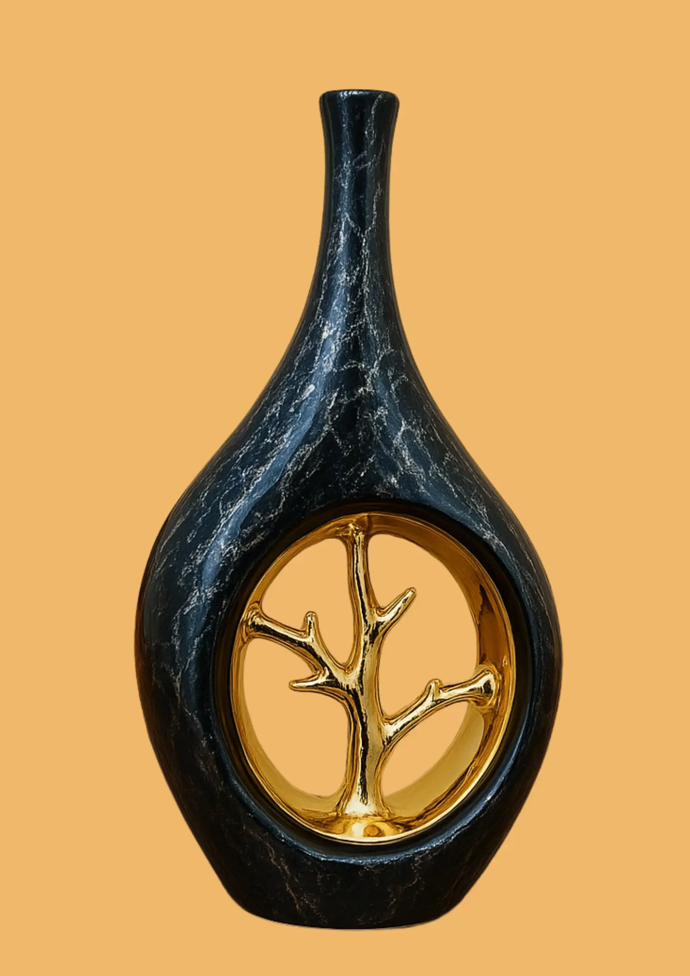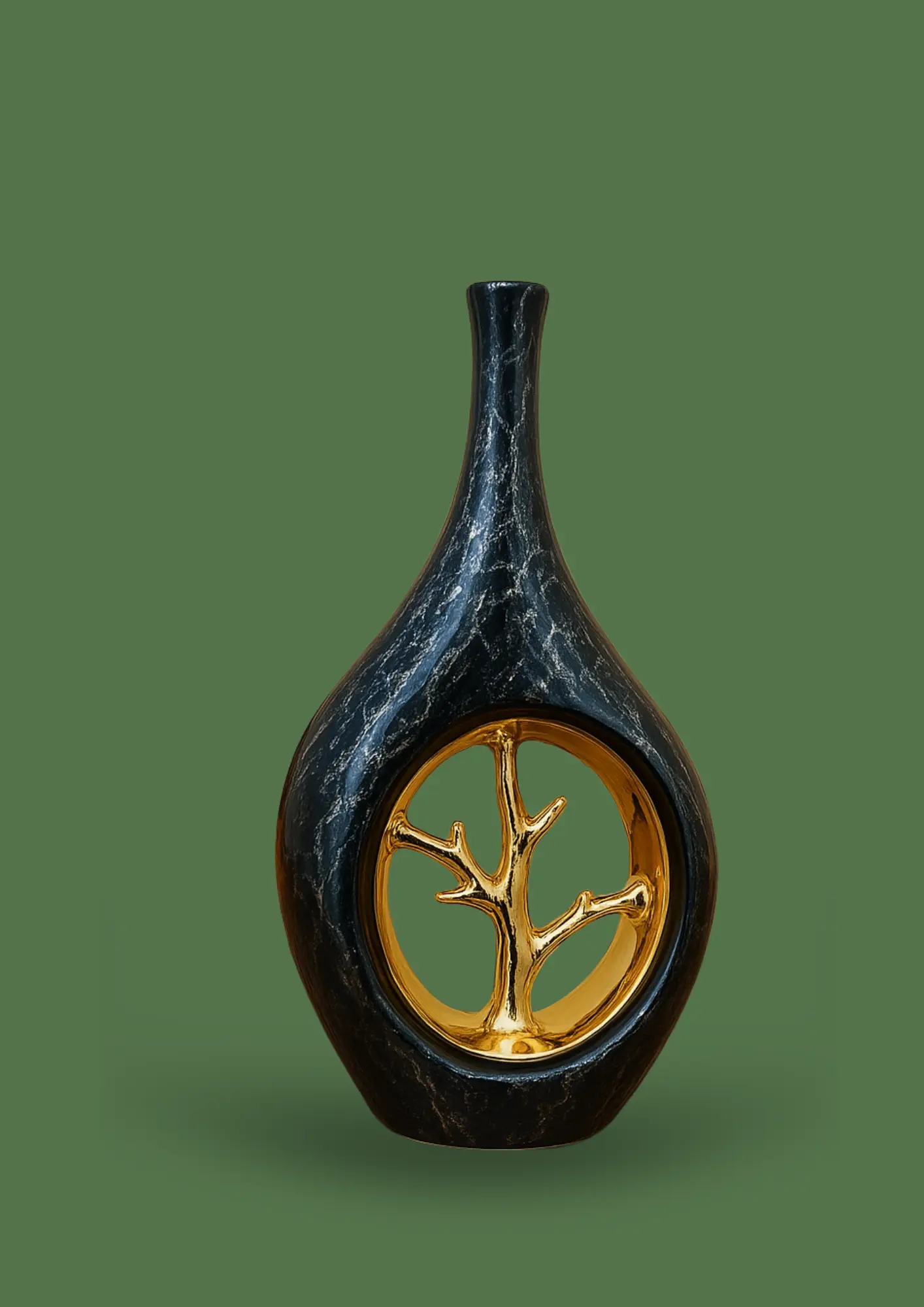 Elevate your interior aesthetics with the Midnight Gold Tree Ceramic Vase, a luxurious decorative piece designed to add artistic flair to any setting. Its unique teardrop silhouette features a hollow center that beautifully frames a sculpted golden tree—symbolizing strength, growth, and elegance.