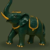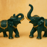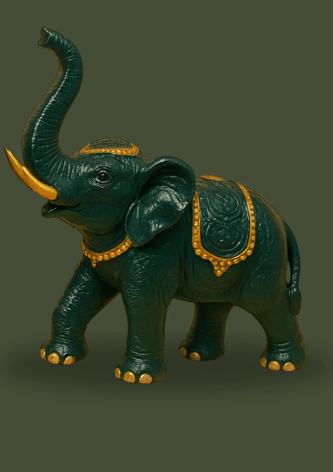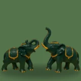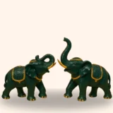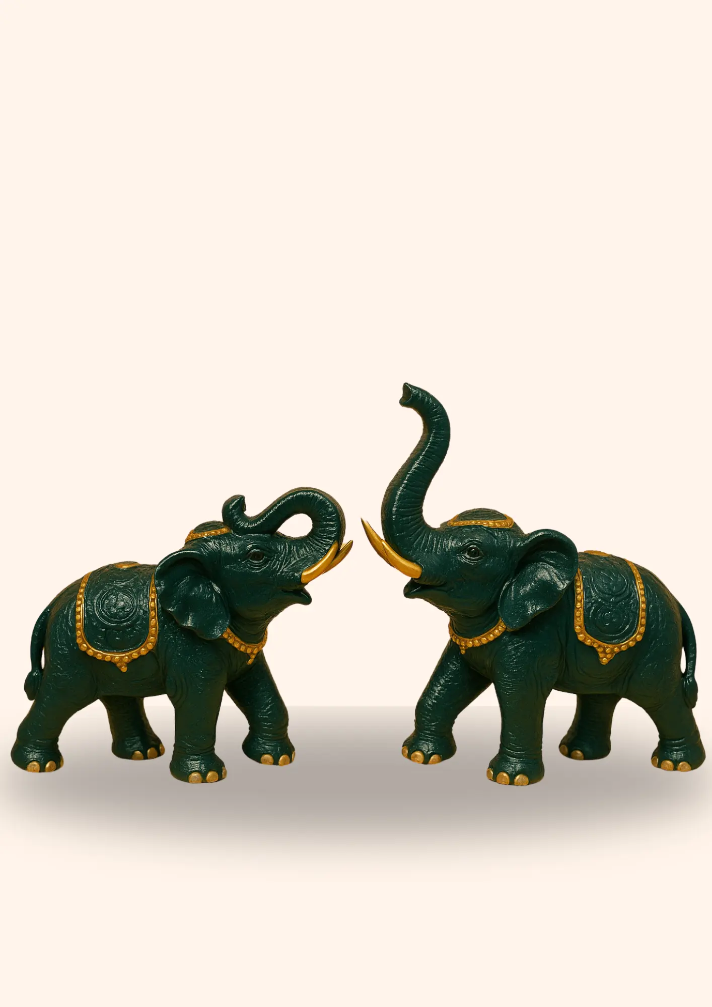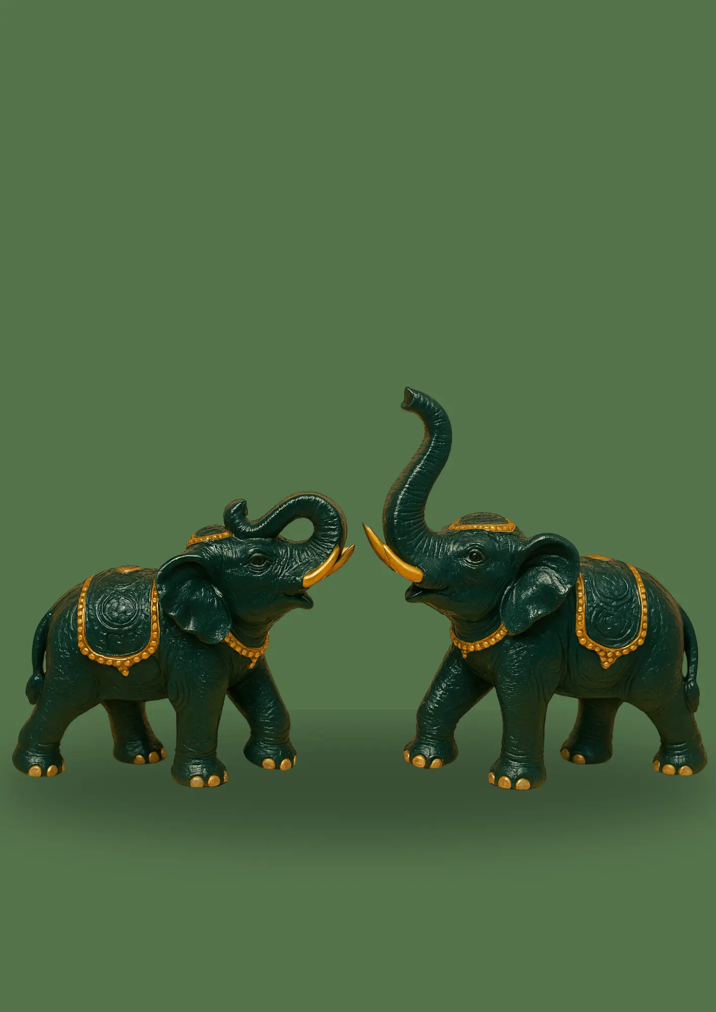 Elevate your space with the charm and symbolism of this Regal Elephant Pair. Crafted from durable, high-grade resin, these statues showcase two beautifully detailed elephants in an enchanting green and gold palette. Their trunks raised high, these elephants are designed to attract positive energy, success, and good fortune according to Vastu and Feng Shui traditions.