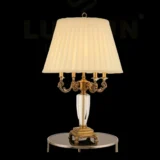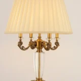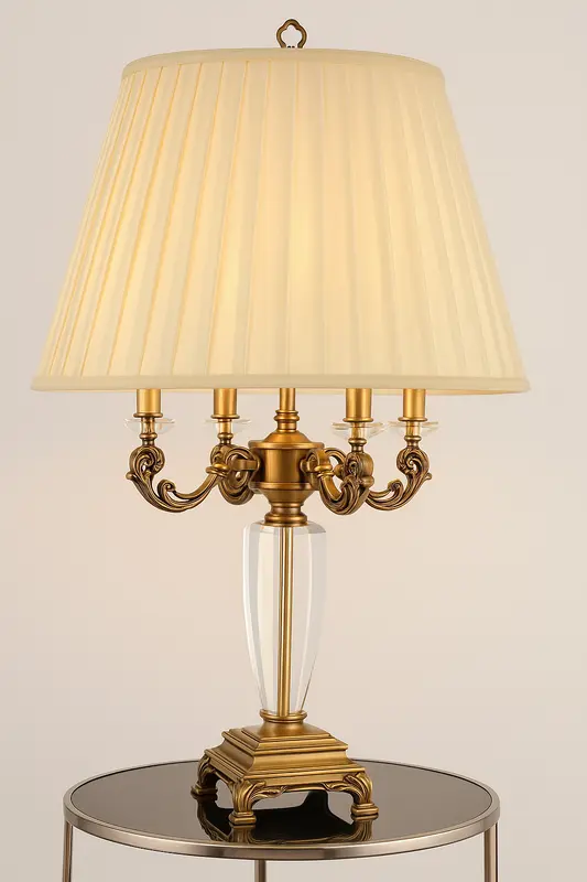 Elevate your home with the Royal Crystal Arm Table Lamp, a masterclass in vintage craftsmanship and luxurious detailing. Featuring intricately carved brass arms adorned with glass embellishments and a stunning crystal base, this lamp is designed to make a bold statement. The pleated fabric shade softens the glow for an inviting ambiance, perfect for luxury homes, heritage villas, or classic-styled interiors.
