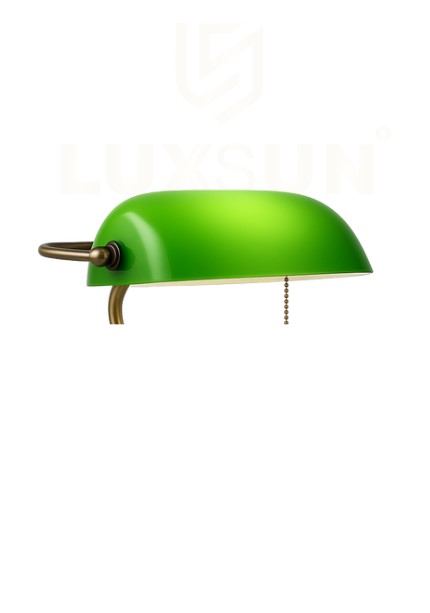 Add timeless elegance to your study or office with this green glass banker’s lamp featuring a vintage brass finish and classic pull chain switch.